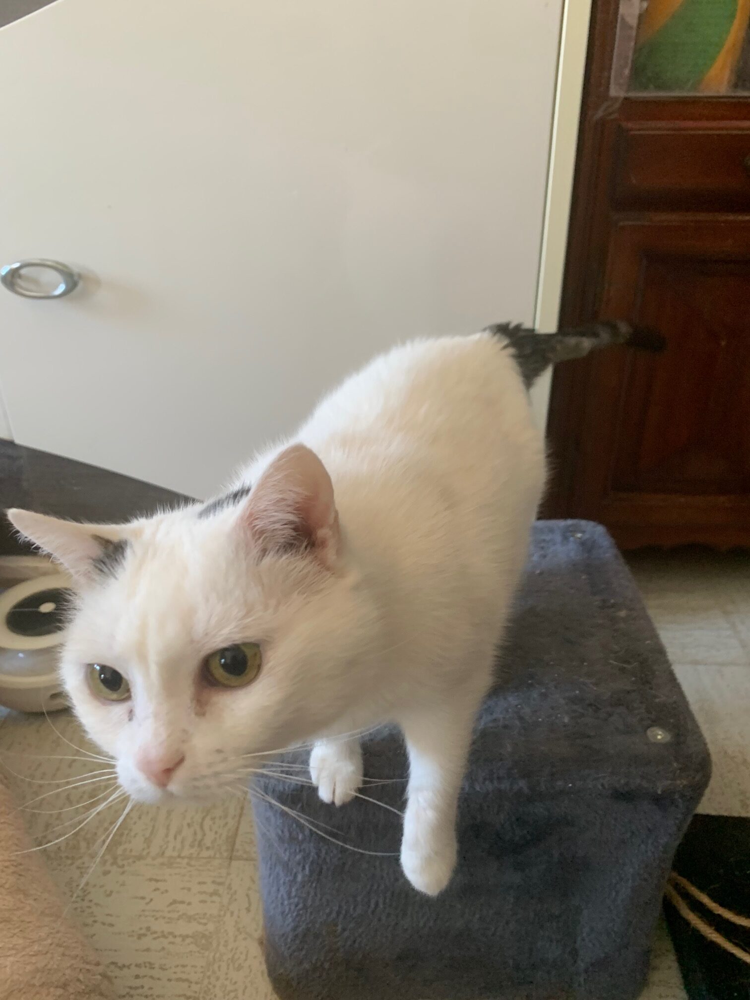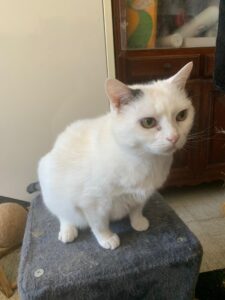 Blanchette est née le 01/05/ 2016. Elle est blanche avec la queue noire te 2 taches sur la tête. C’est une petite minette, très douce, très gentille qui tend la patte toujours pour avoir des